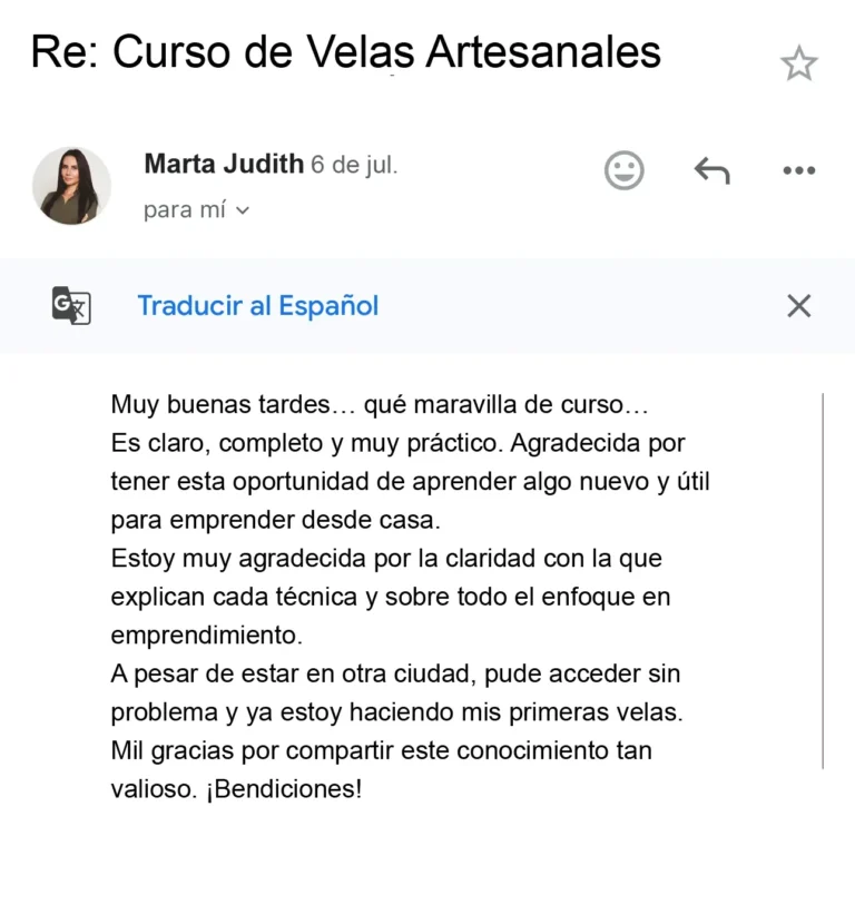 Al realizar la compra, recibirás de inmediato un correo electrónico con el acceso al curso completo “Velas artesanales para emprender” junto con todos los bonos adicionales.
